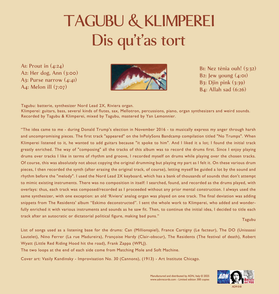 The title "Dis qu’t’as tort" is a linguistic play: in French, its pronunciation echoes "Dictator", though it translates as "Admit you are wrong". This clever juxtaposition serves as an oxymoron, highlighting the irony that dictators rarely, if ever, acknowledge their faults. The anger and frustration inherent in this message are channelled through purely instrumental compositions - no lyrics or spoken word are employed, as the music itself communicates the sentiment powerfully. The album features chaotic drumming, electronic textures from vintage synthesizers, distorted guitar riffs, and fragmented song structures, all of which work together to convey the intended emotional impact.